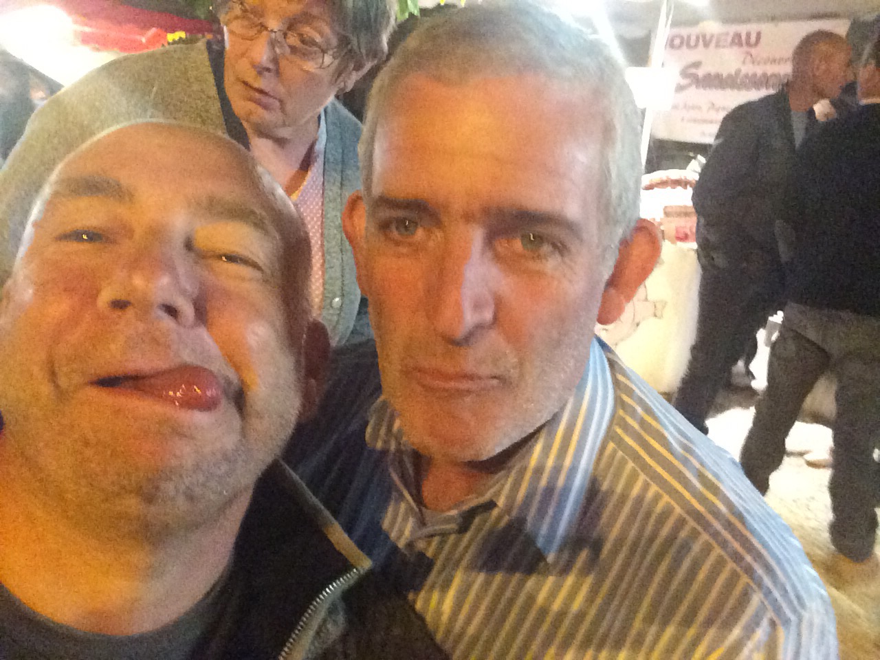 Finally the Blasimon Marché Nocturne – held every Wednesday in august. Similar drill but this time a rather good Edith Piaf singer ‘non, je ne regrette RIEN’ and so on. We went to this one with my brother and his partner who were visiting and they got a good old dose of lovely frenchiness. We bought bottles of wine this time which are uncorked by the producers – we bought from two sisters who are running a vineyard near sauveterre – very acceptable red – and steak and chips cooked by the butcher who supplies them – fantastic steak we are going to seek out the butchers near Branne. On the table next to us was a whole extended family – grandma, grandad, mum, dad and kids who brought salami type sausage with them to eat with bread as an entree and then they moved onto the mains – salad with smoked duck and bacon mostly. The grandad who we spoke to is a ‘traiteur’ near La Reole and he gave us all some of his home made rum cocktail which as far as I could tell was rum, orange, pineapple and some other stuff I didn’t recognise. Hit the spot tho’. We told him about our Ruchelaise gin, and we have promised to meet again this Wednesday at the last night market of the season and give him some of our gin in exchange. A great night. That is grandma squeezing past my rather bladdered husband and brother.