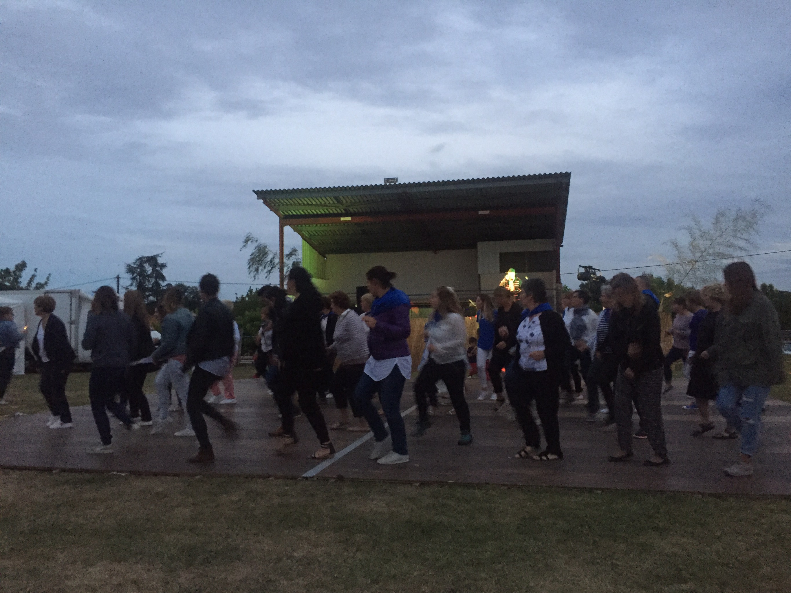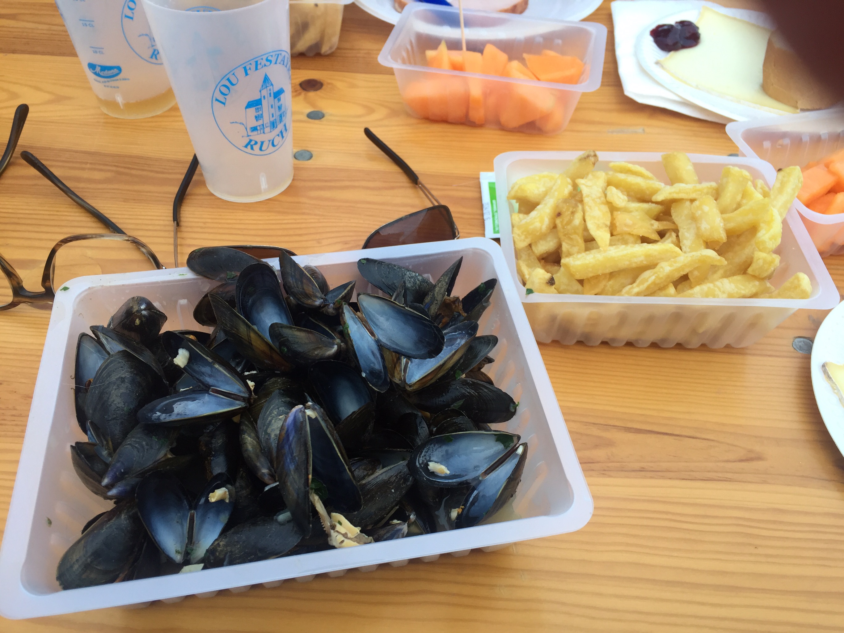 So, the Ruch fete took place at the Stade Bonvoisin (named after a former Mayor and alleged lothario, but that is another story). It lasted three days and nights, with 3 different suppers. Everyone was asked to wear a blue neckerchief in the basque style for reasons that have escaped me but at least half the population did. One night was a repas escargots – not for us I am afraid, but we went for the sunday night moules frites. The system for purchase was fairly mystifying – but eventually we discovered you had to pay to get in (we walked across the vineyards and into the back field, so avoided the entrance fee to start with), then a series of tickets to get your glass and have it filled with wine (rose or red, no white as usual) and a queue (always fun – in this one John had a lengthy conversation with the man behind about whether M Macron would turn out to be any good – consensus was ‘non’) whereupon in a very lengthy process presided over by three nice ladies d’un certain age, we got four differently coloured slips of paper printed in turn with ‘melon’, ‘moules’, ‘frites’, and ‘fromage’. These four tickets were then taken over to the kitchen tent and handed over en masse to the people running that (including Raymond who we bought our field from) where all four items were piled on a tray for you to take over to the trestle table.